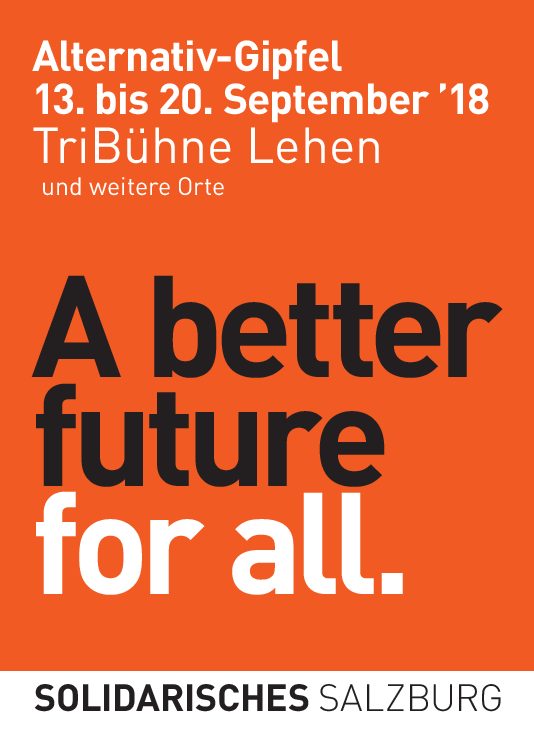 Aus Anlass eines Gipfeltreffens der EU-StaatschefInnen, das sich gemäß den „Ideen“ des österreichischen Ratspräsidenten Kurz am 20.9. in Salzburg zu Themen der Abschottung der EU, des Schutzes der Außengrenzen und der Eindämmung der „illegalen“ Migration befassen wird, veranstaltet das zivilgesellschaftliche Netzwerk Solidarisches Salzburg einen Alternativgipfel – von 13. – 20.9.2018 -, um sicherzustellen, dass Themen mit großer Relevanz für Europa und Österreich nicht schlicht vergessen werden.